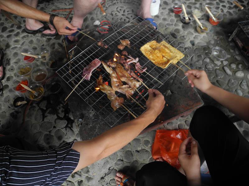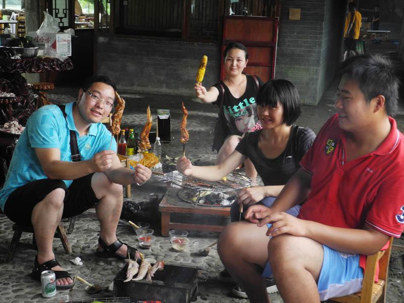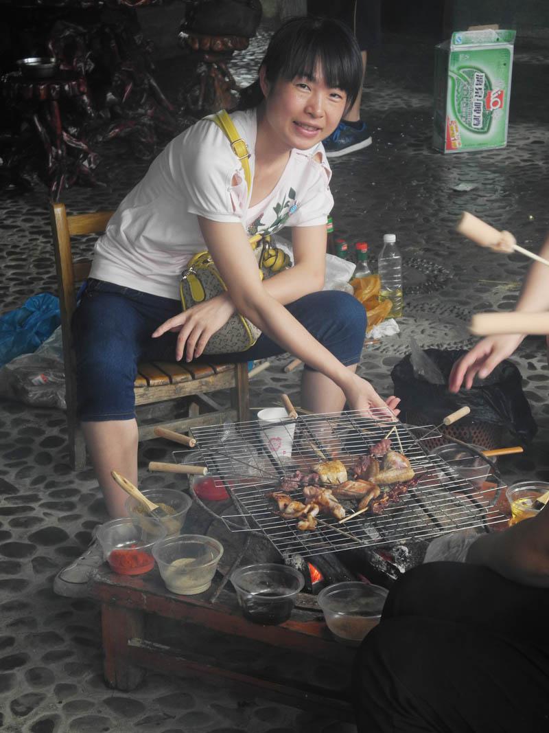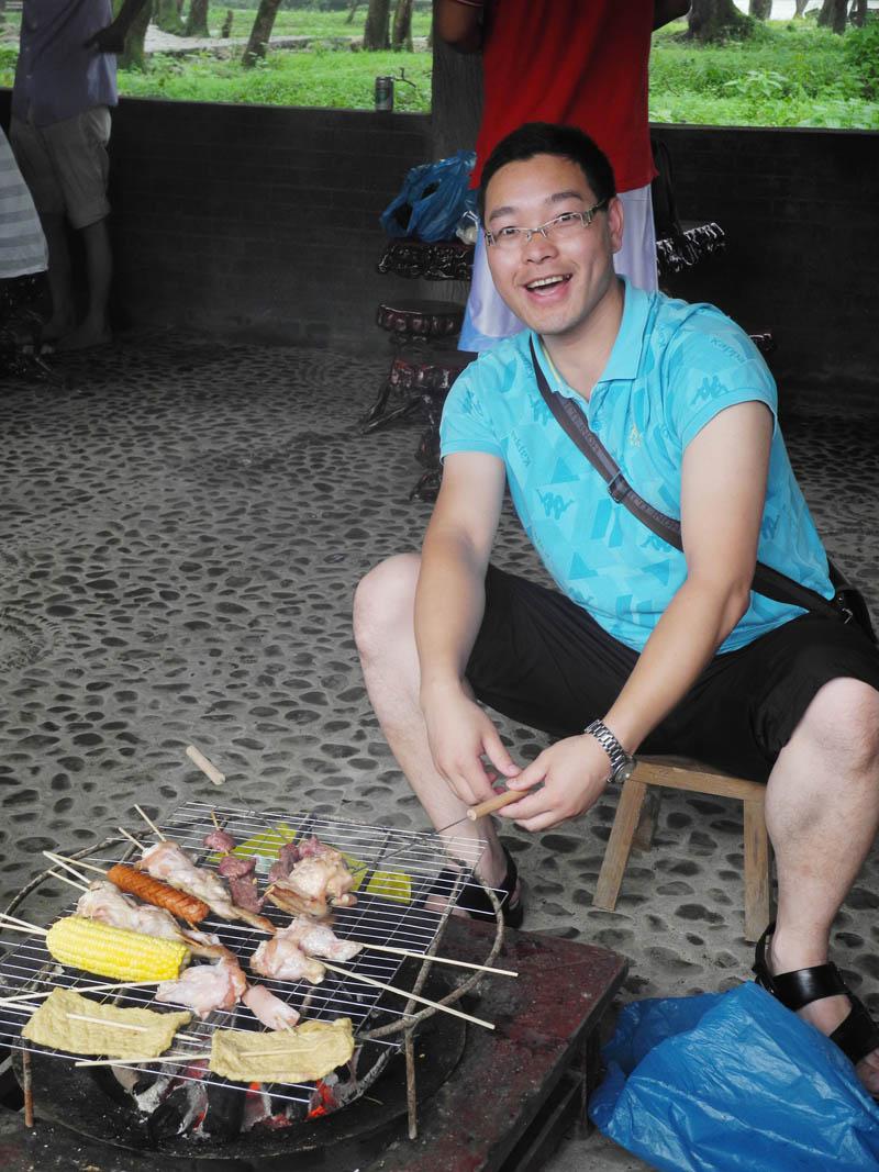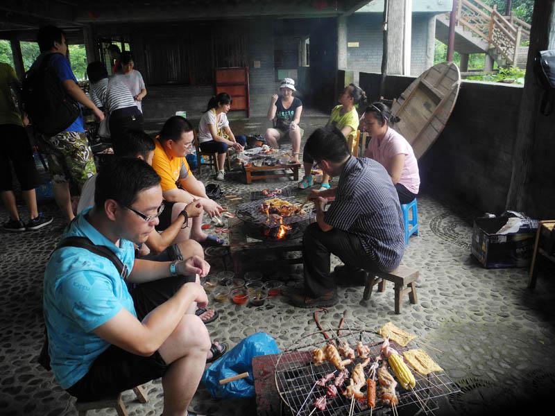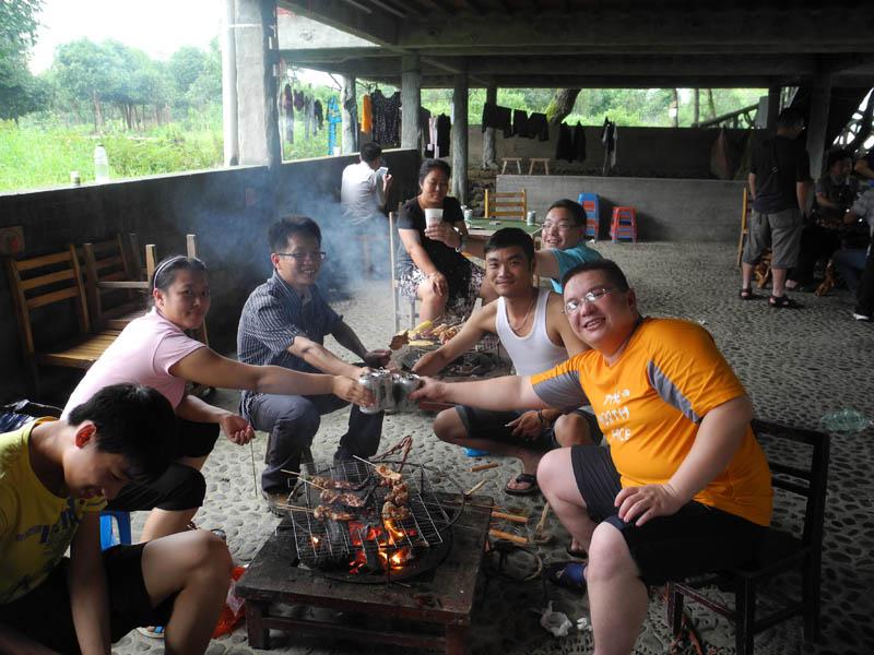 10點左右到達臨桂蓮花島,周圍環(huán)境優(yōu)美,空氣清晰的田園風光令大家心曠神怡。有玩水的,有照相的,有去看別人在河邊釣魚的,還有迫不及待地著手準備燒烤的,有的幫著清洗燒烤工具,有的清洗青菜,有的用鐵叉將食物叉起來,有的把食物調味料分好類,好一派忙碌的景象!我們這次準備的食物很多,有雞翅、雞腿、雞爪、牛肉、五花肉、魷魚、香腸、茄子、豆腐干、綠茶等等,滿足了大家的需求。經(jīng)過一番準備,大家就著手開始燒烤了,圍著火爐旁邊,你一串雞翅,我一串牛肉,一人拿著一個鐵叉,一邊涂著各種佐料,一邊有說有笑,雖然圍著火爐有點炎熱,但從那陣陣歡聲笑語和忙碌的身影中,我感受到的是其樂融融與和諧美好,不大一會,香味就充斥在整個場地,一個個拿著自己杰作得意的炫耀著、攀比著,而馬上又狼吞虎咽的吃起來,有的人手法不專業(yè),烤出來的東西外焦內生,剛吃下去就發(fā)現(xiàn),中招了……有的人比較厲害,烤出來的東西很誘人,搞得大伙兒搶來搶去,有的比較頑皮,從這邊吃到那邊,一會兒去這邊“偷”一點兒,又去那邊“拿”一點,引得一陣嬉笑打鬧,玩得可真開心呀!