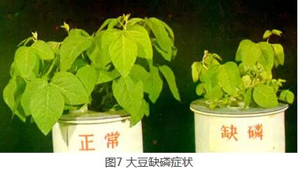 大豆缺磷:葉色變深,呈濃綠或黑綠色,葉形小、尖、窄,且向上直立,植株瘦小,生長緩慢。嚴(yán)重時,莖稈可能出現(xiàn)紅色,開花后大豆若缺磷,葉片則出現(xiàn)棕色斑點。