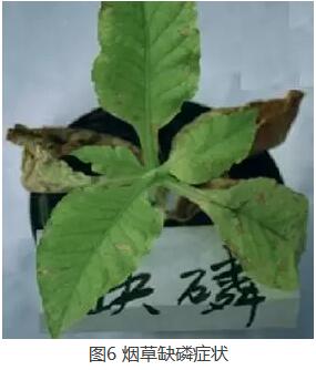 煙草缺磷:整株簇生狀,葉窄、色暗,直立,老葉有壞死斑點,干枯后變棕色。經(jīng)火烤后的煙葉色暗無光澤。