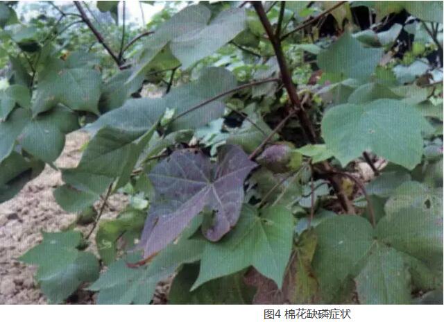棉花缺磷:植株矮小,蒼老,葉色灰暗、莖細(xì),基部紅色。果枝少、葉片小、葉緣和葉柄常出現(xiàn)紫紅色,根系發(fā)育不良,成熟延遲,蕾鈴易脫落,產(chǎn)量及品質(zhì)下降。