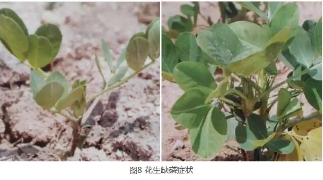 花生缺磷:老葉呈暗綠至藍(lán)綠色,以后變黃而脫落,莖基部紅色。