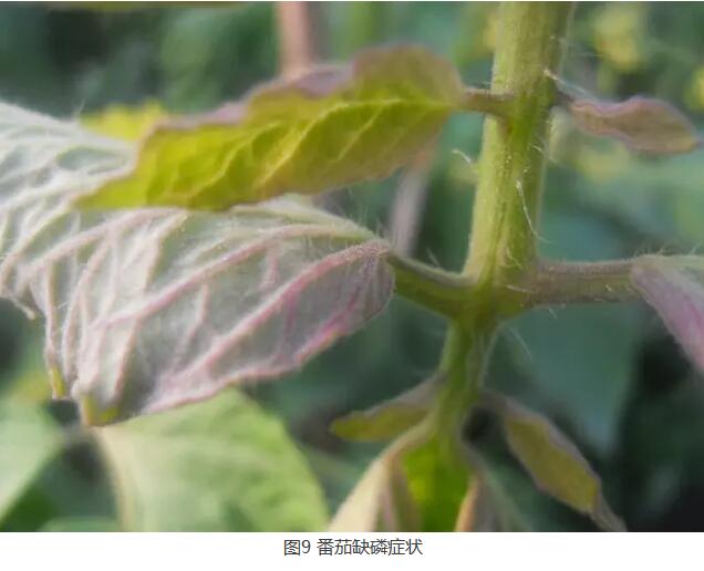 番茄缺磷:在苗較小時下部葉變綠紫色,并逐漸向上部葉擴展。早期葉小并逐漸失去光澤,葉背呈紫紅色,葉片上葉肉組織開始出現(xiàn)褐色斑點,隨后則擴展到整個葉片上,葉片僵硬,葉脈逐漸變?yōu)樽霞t色,葉簇最后也呈紫紅色,下部葉片上卷,葉尖變黑褐色枯死,老葉變黃。莖細(xì)長且富含纖維。結(jié)果延遲,果實小,受到明顯抑制,成熟晚,產(chǎn)量低。由于缺磷時影響氮素吸收,植株后期呈現(xiàn)卷葉。