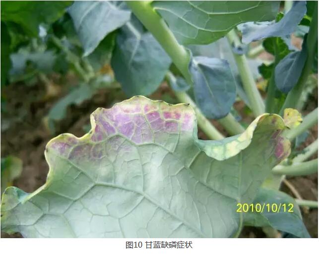 甘藍(lán)缺磷: 葉片呈現(xiàn)雜色,葉背面呈紫紅色,葉脈初更為明顯。生長發(fā)育受阻,產(chǎn)量下降。
