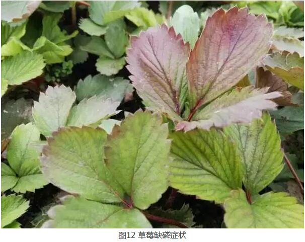 草莓缺磷:植株生長弱、發(fā)育緩慢、葉色帶青銅暗綠色。缺磷加重時,上部葉片外觀呈現(xiàn)紫紅的斑點,較老葉片也有這種特征。缺磷植株上的花和果比正常植株小。含鈣較多或酸度高的土壤以及疏松的沙土或有機質(zhì)多的土壤易發(fā)生缺磷現(xiàn)象。
